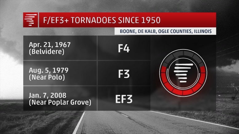 According to the National Climatic Data Center, only three tornadoes of F/EF3 intensity or stronger on the Enhanced Fujita scale have occurred in Ogle, De Kalb or Boone counties in records dating to 1950.