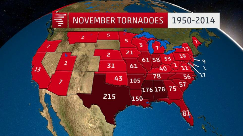 The map above shows how many tornadoes have been confirmed by the National Weather Service during the month of November from 1950-2014. Texas has the most, but when adjusted for total area, Mississippi has the most, followed closely by Louisiana and Alabama.