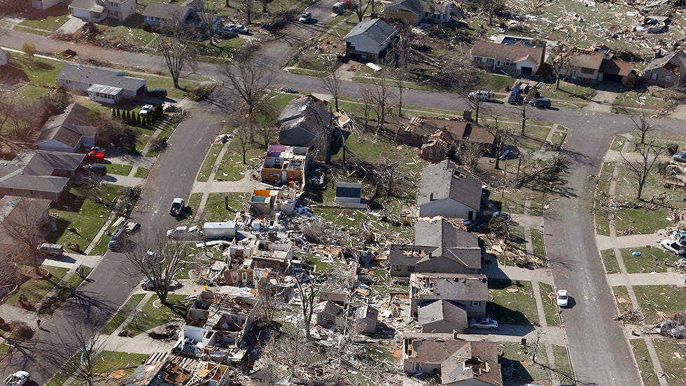 This aerial view on Nov. 18, 2013, shows homes that were destroyed by a tornado that hit the western Illinois town of Washington on Sunday. It was one of the worst-hit areas after intense storms and tornadoes swept through Illinois. (AP Photo/Charles Rex Arbogast)