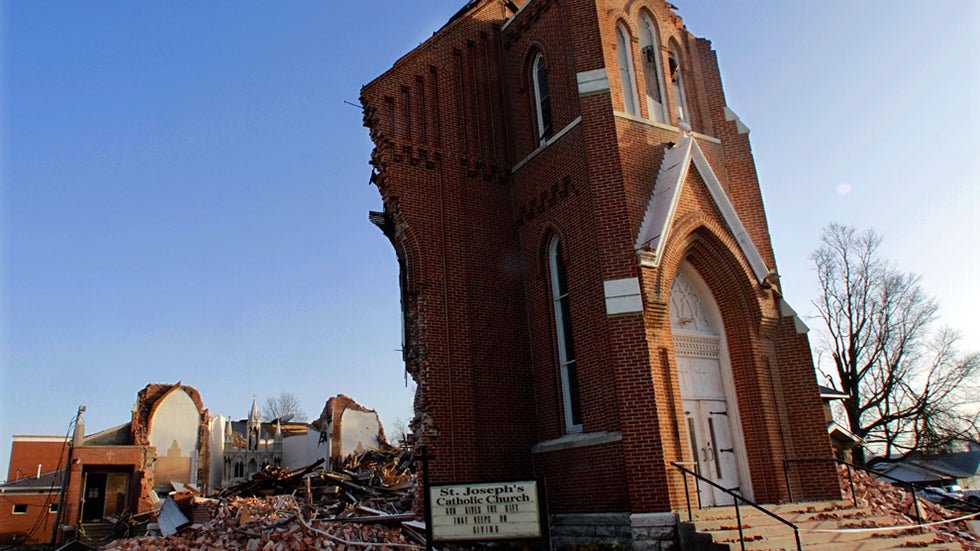 St. Joseph's Catholic Church in ruins, March 1, 2012, in Ridgway, Ill. A pre-dawn tornado flattened entire blocks of homes as violent storms ravaged the Midwest and South.