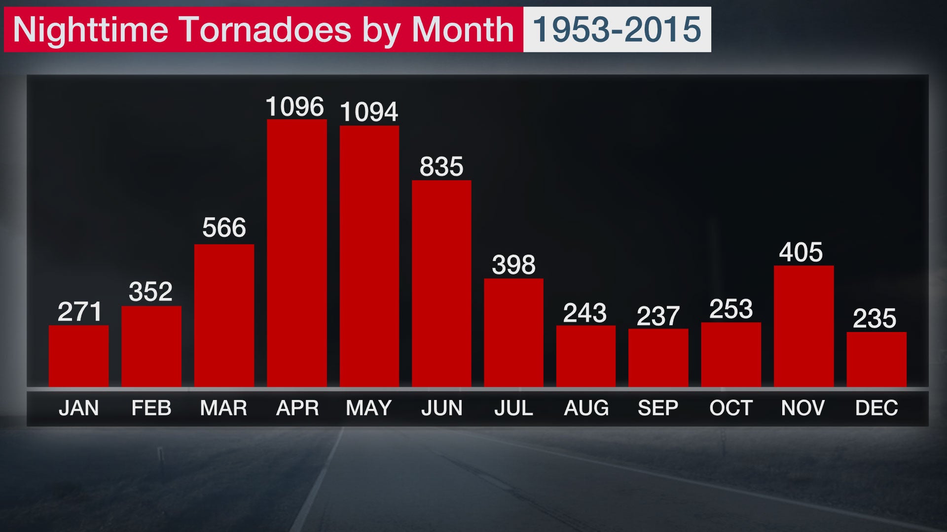 Even the core winter months of December through February have averaged three to six nocturnal tornadoes in the U.S. each month from 1953 through 2015, according to NOAA's Storm Prediction Center.
