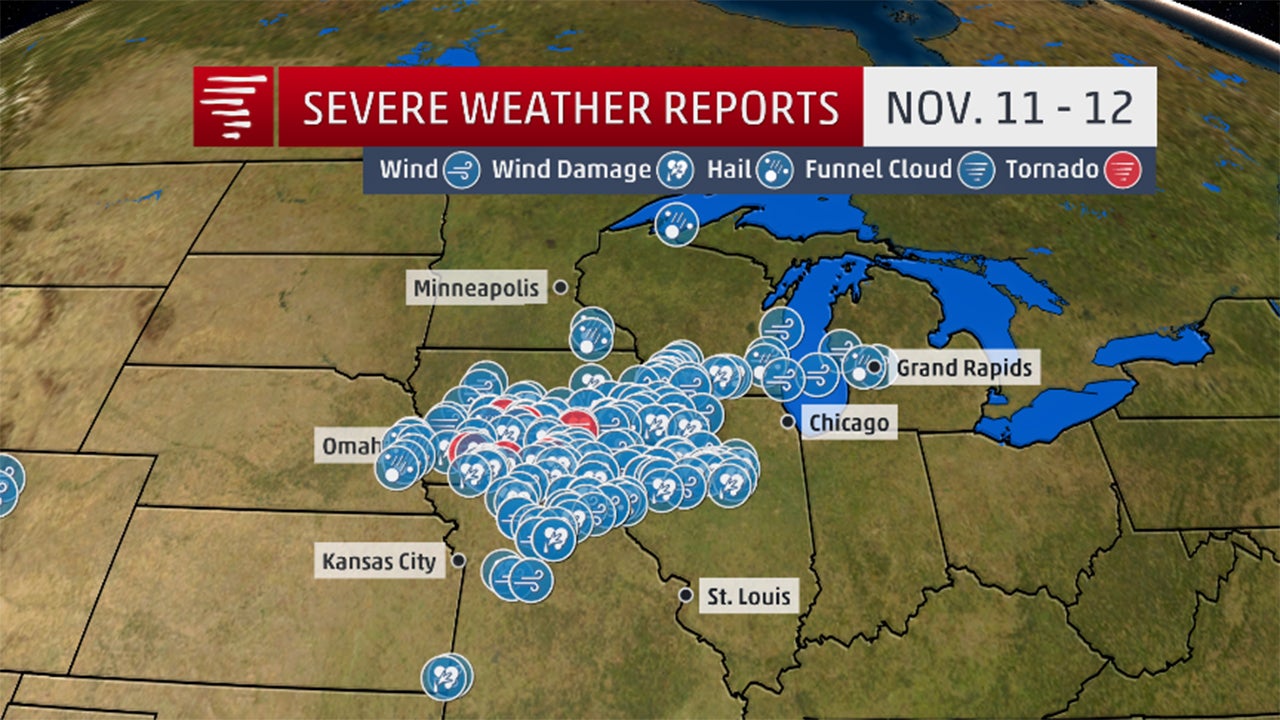 Severe thunderstorms and tornadoes tore across parts of the Midwest on Veterans' Day.