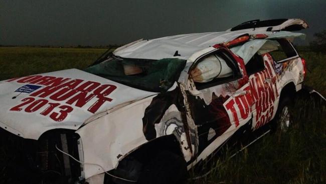 The photo shows the SUV Mike Bettes and a few of his crew member were travelling in when it was thrown by the tornado.