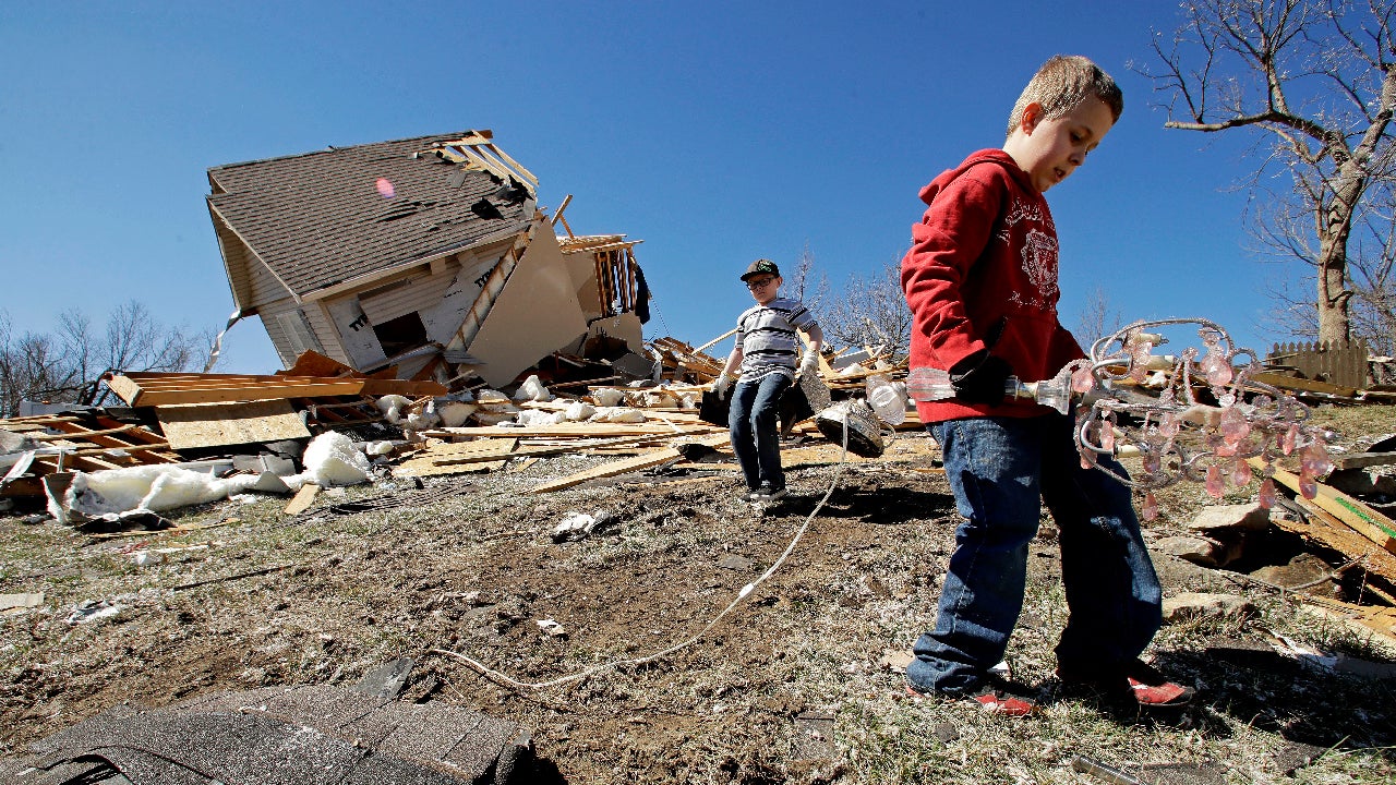 Kadin Lance, right, and his brother Carter Lance pick up debris at a friend's destroyed home Tuesday, March 7, 2017, after a tornado damaged tore through Oak Grove, Missouri, Monday night. (AP Photo/Charlie Riedel)