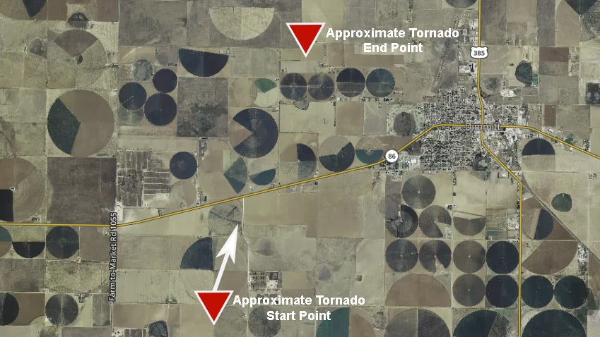 The tornado moved on a north-northeast path west of Dimmitt, Texas, across mainly rural locations.