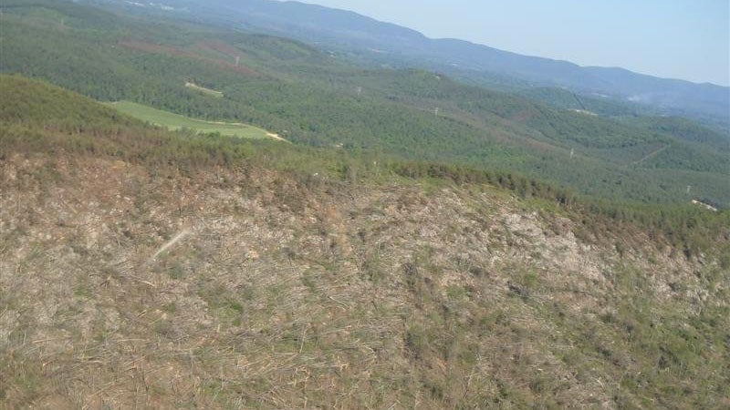 Severe tree damage with mountains in the background from an EF4 tornado that moved along a path from Argo to Shoal Creek, Ohatchee and Forney, Alabama, on April 27, 2011.