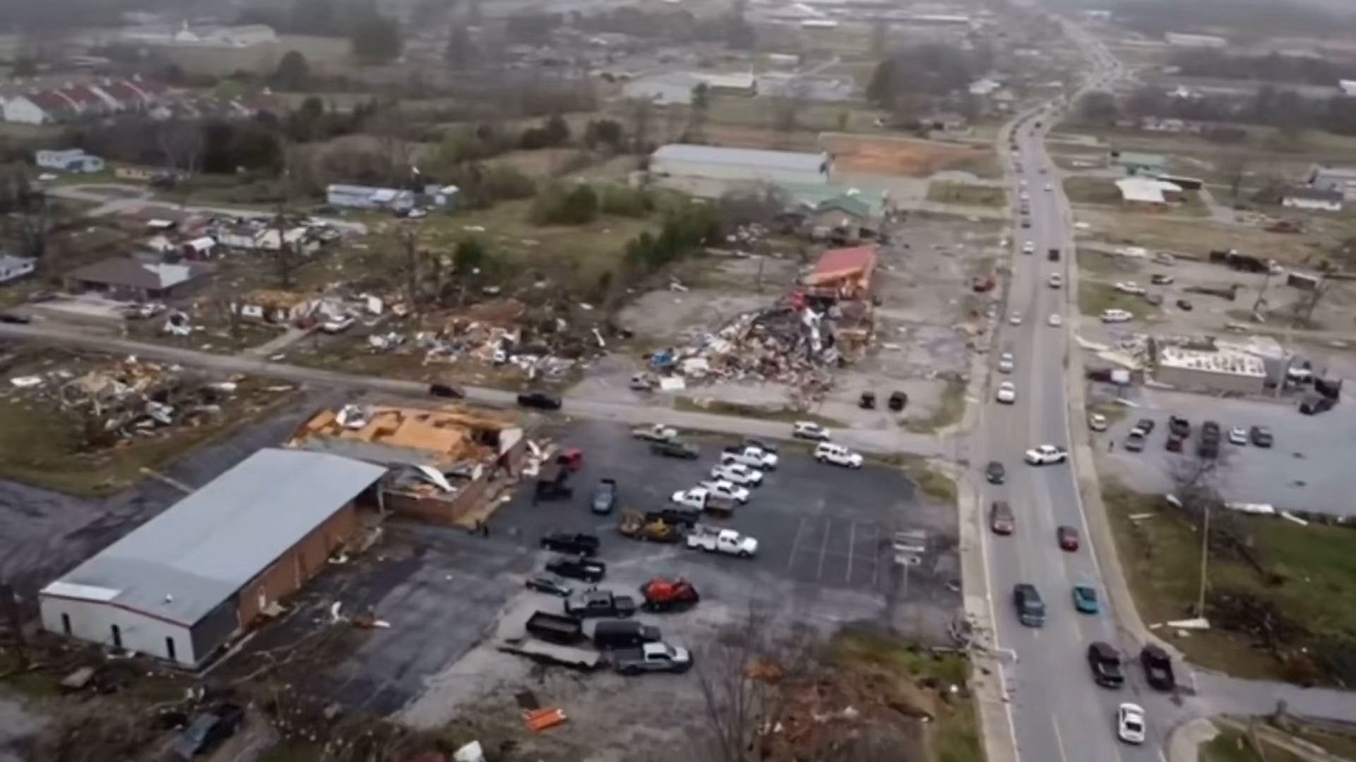 Drone footage reveals the staggering damage left behind by a likely tornado in Arkansas, showing flattened buildings, scattered debris and the heartbreaking aftermath of a storm system that claimed at least three lives across the state.