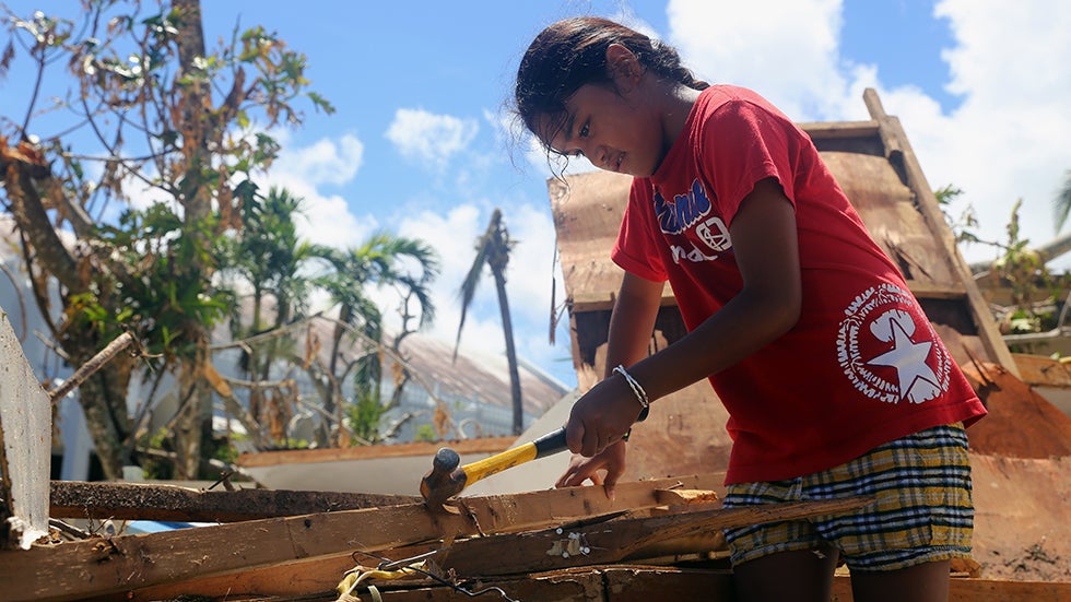 A girl helps her parents repair their storm-damaged home by removing nails from plywood on Saturday, Aug. 8, 2015, in Saipan, Northern Mariana Islands.