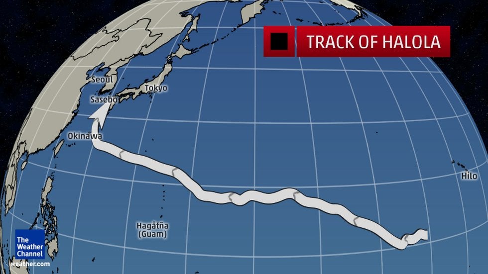 The track of Halola from its birth as a tropical depression in the Central Pacific to its demise over western Japan. In all, its path as a tropical cyclone was about 4,750 miles long.