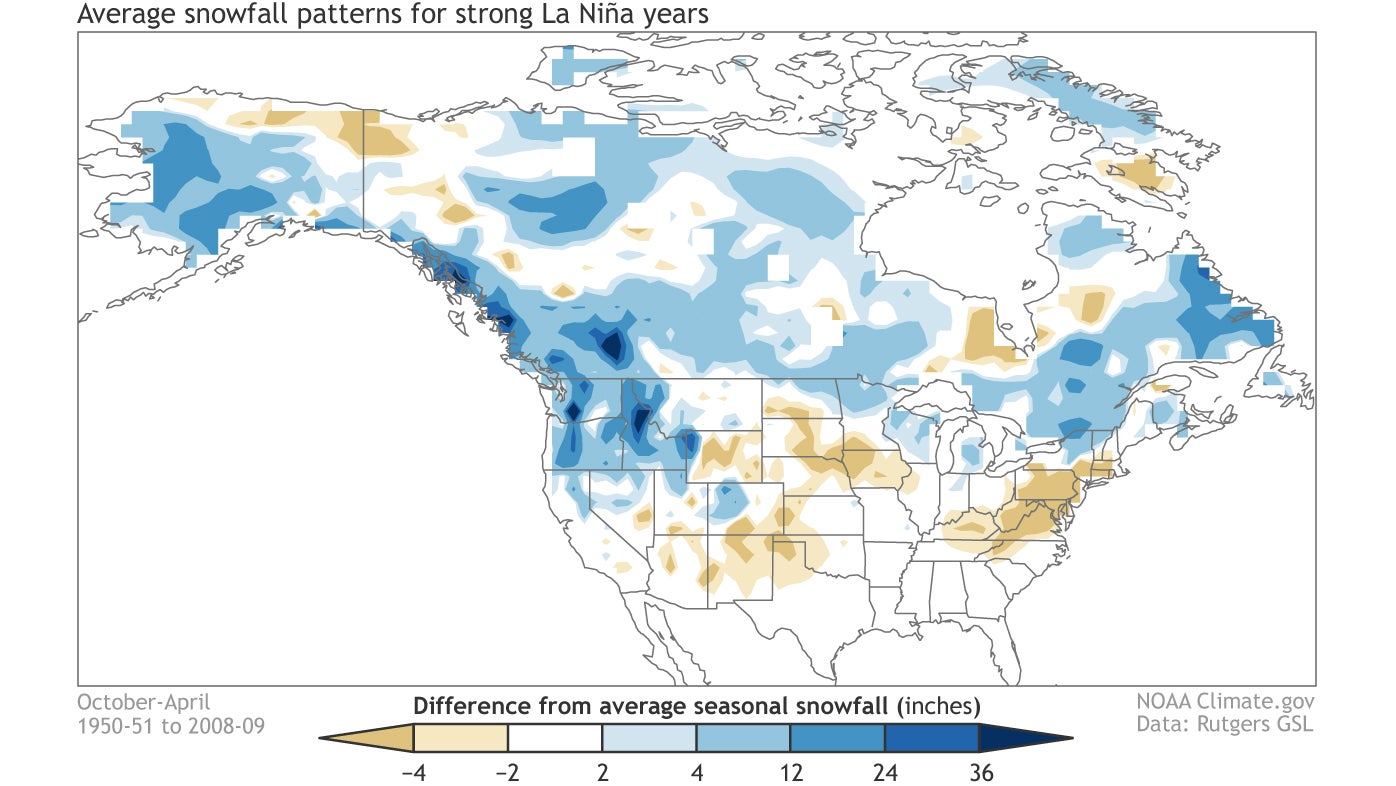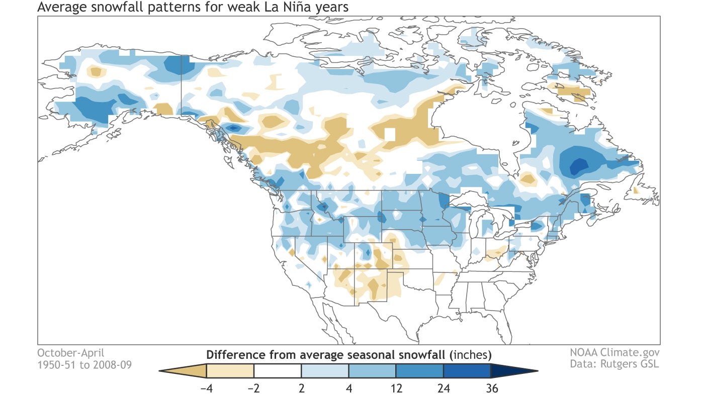 Overall, a strong La Niña has more of an effect on seasonal snowfall over western North America. Weak La Niña events often feature more widespread above-average snowfall across the northern tier of the U.S.