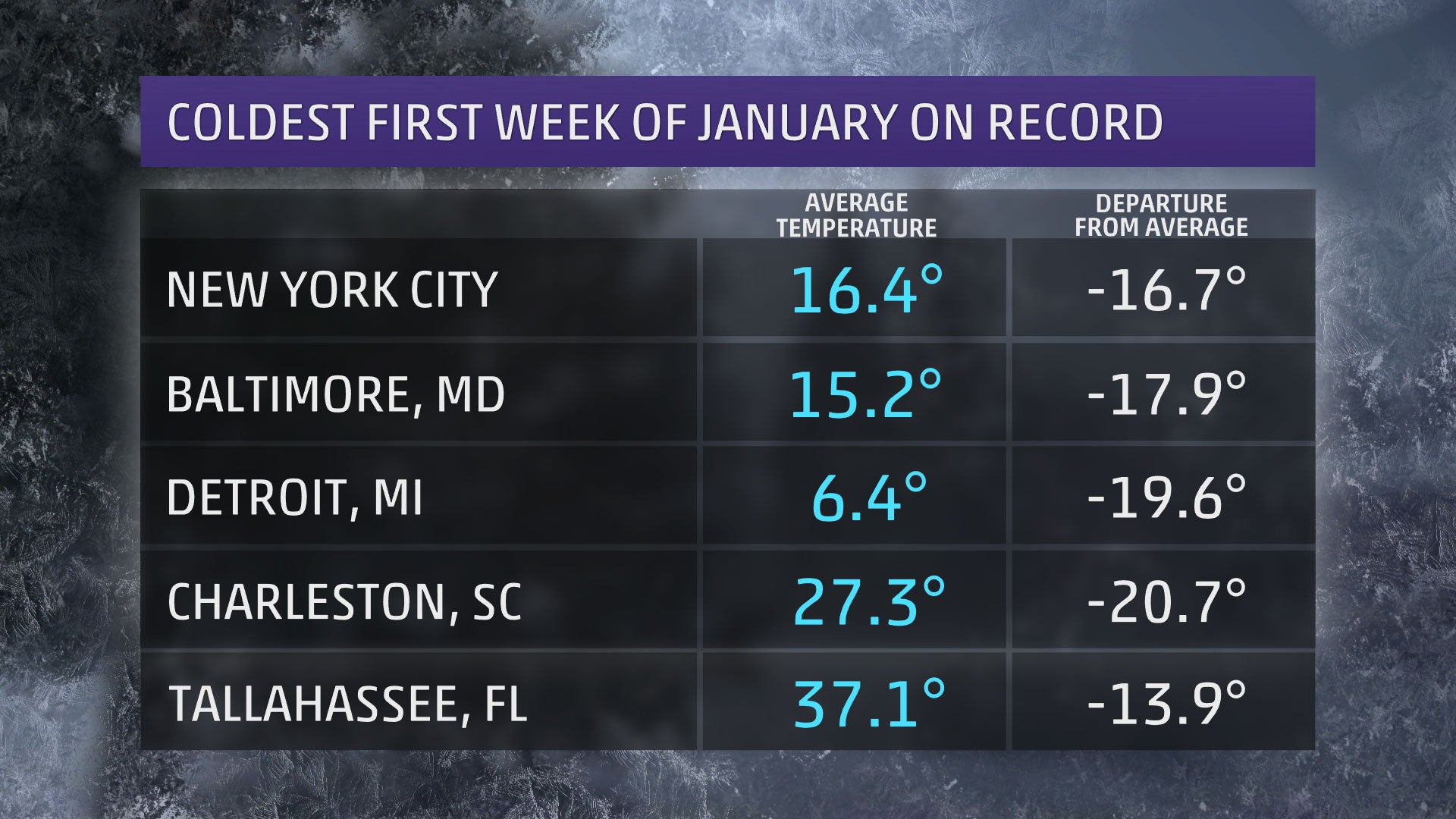 Selection of cities that experienced the coldest first week of the year on record this year.