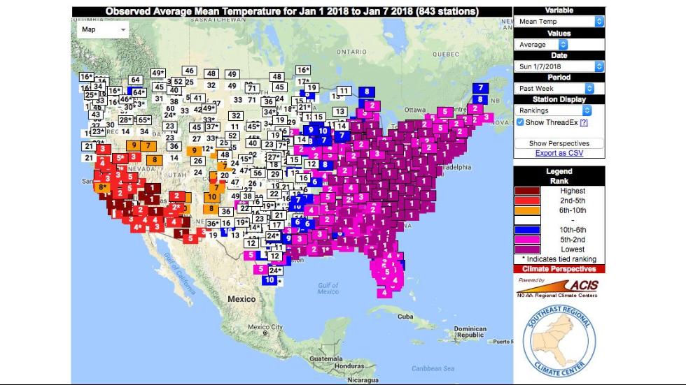 Temperature rankings for Jan. 1, 2018, through Jan. 7, 2018, compared to other first weeks of the year. Purple boxes indicate cities that had at least a top-five-coldest first week of the year.