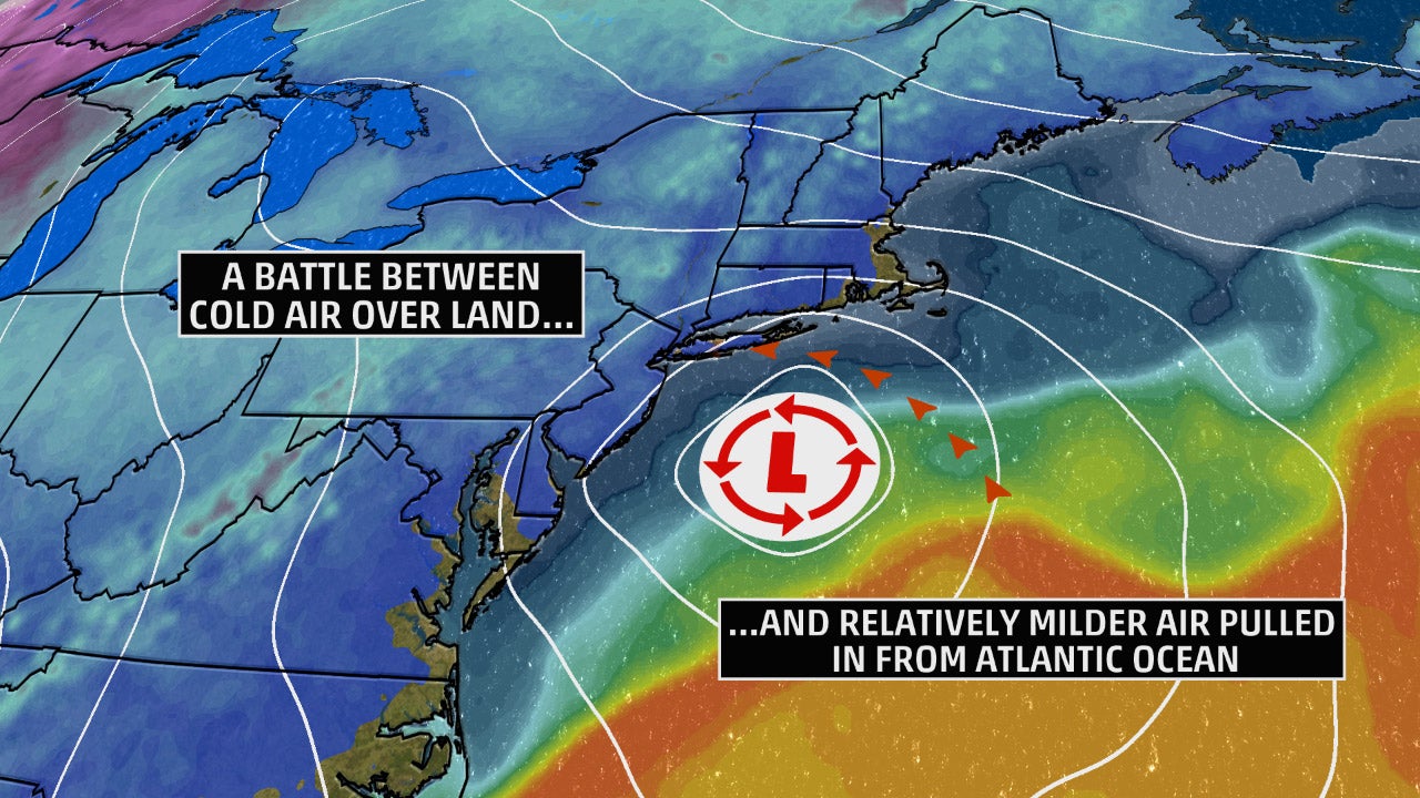 To determine if the cold air or milder Atlantic air wins out, meteorologists examine the track of the developing coastal storm.