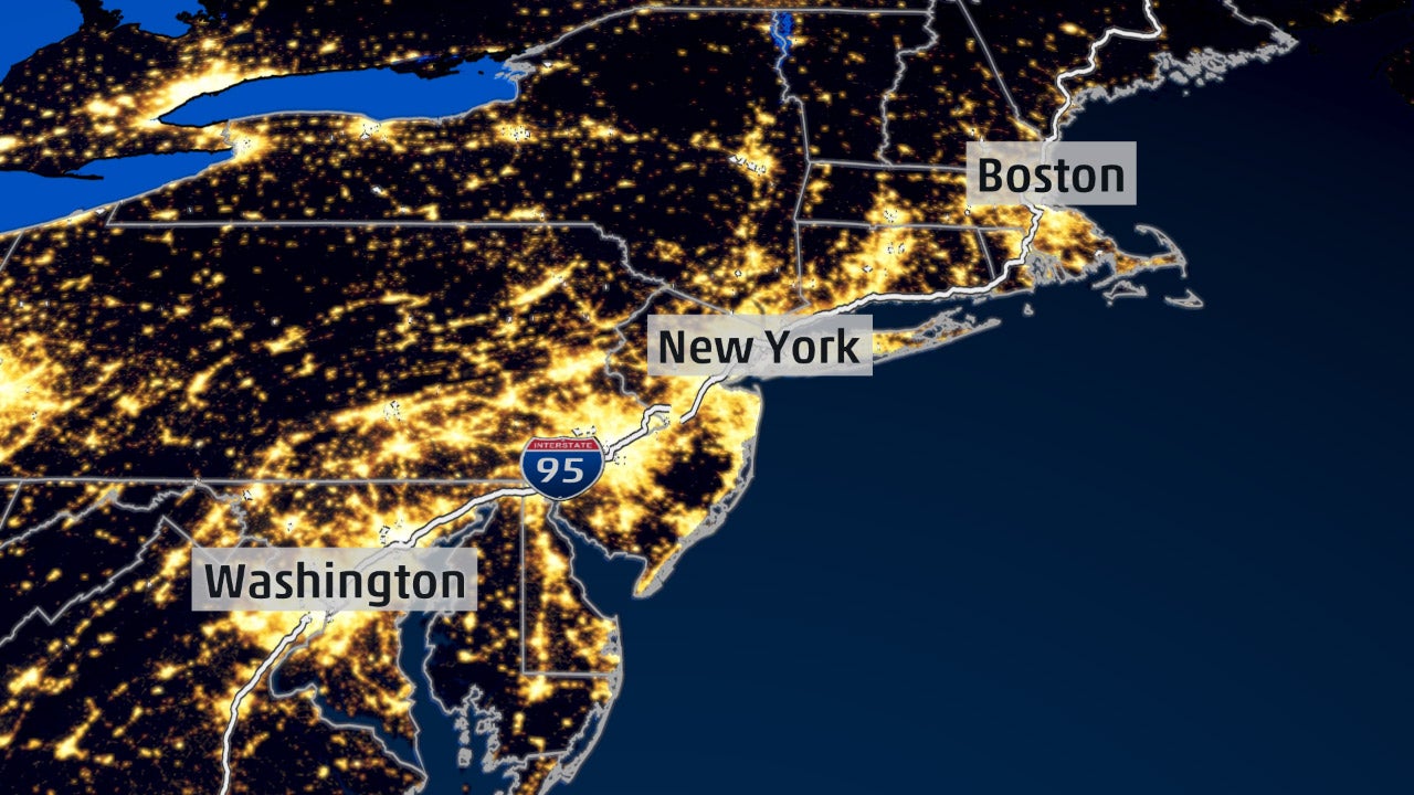 An overlay of city lights across the Northeast Megalopolis illustrating the dense population.