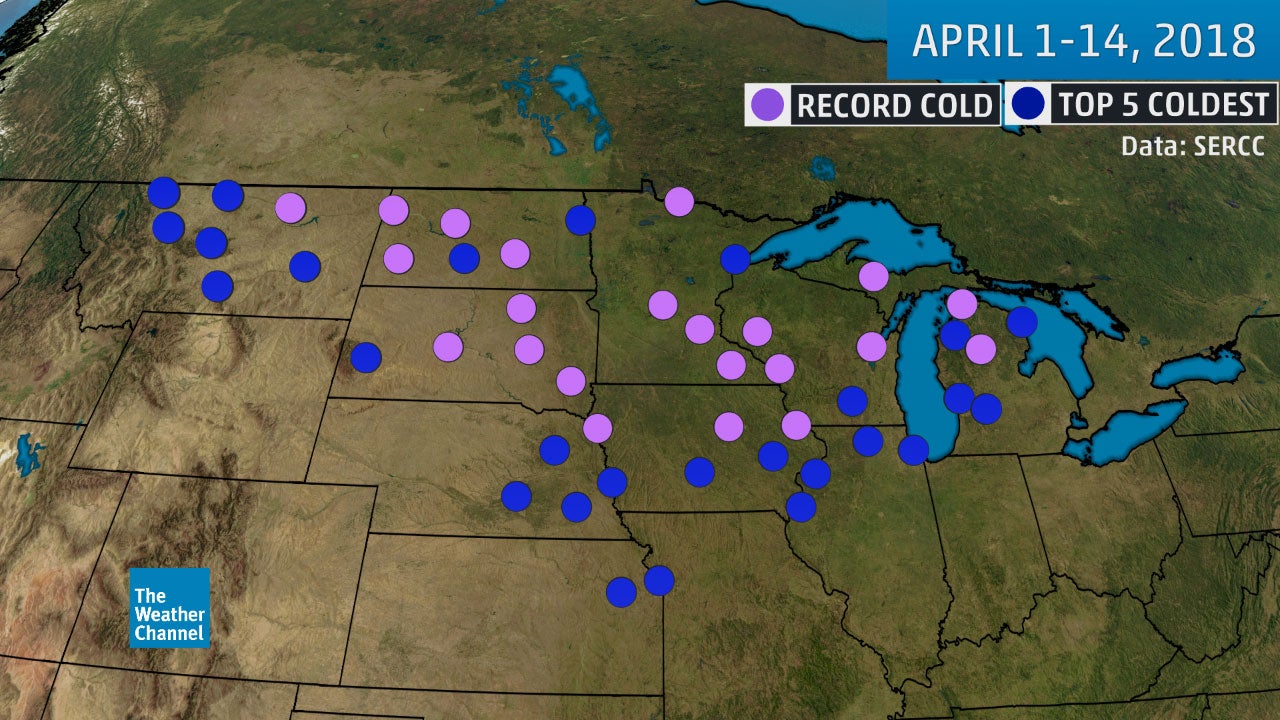 The cold temperatures April 1 to 14 set a record for that period of time in Green Bay, Wisconsin, Minneapolis/St. Paul and Sioux City, Iowa, according to data from the Southeast Regional Climate Center (SERCC). For Chicago, Kansas City and Omaha, Nebraska, it was the fifth-, fourth- and second-coldest April 1 to 14 on record, respectively.