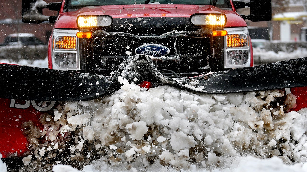 A snow plow driver clears snow in a parking lot on Monday, Nov. 26, 2018, in Okemos, Michigan. (Nick King/Lansing State Journal via AP)