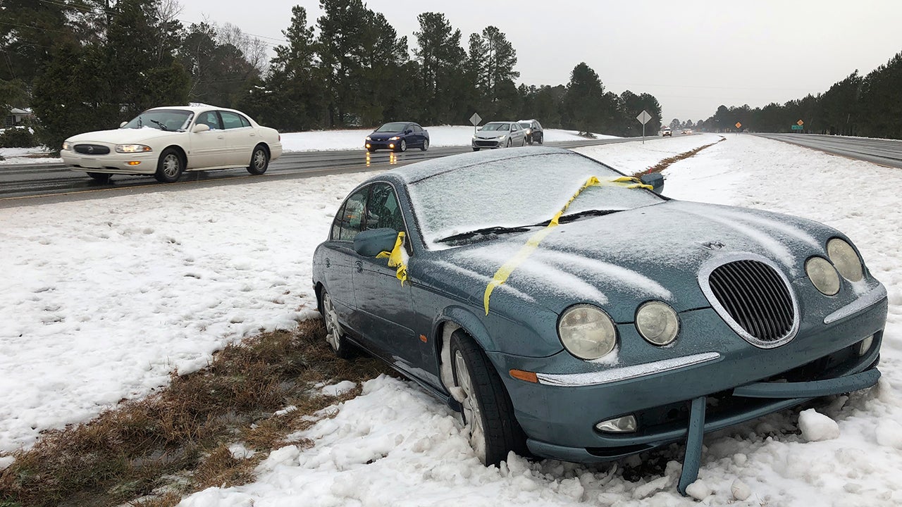 Vehicles pass a stranded Jaguar in the median of U.S. 1 in Raleigh, N.C., on Monday, Dec. 10, 2018. Gentle snow turned to sleet, then rain Monday, and was expected to freeze overnight. (AP Photo/Allen G. Breed)