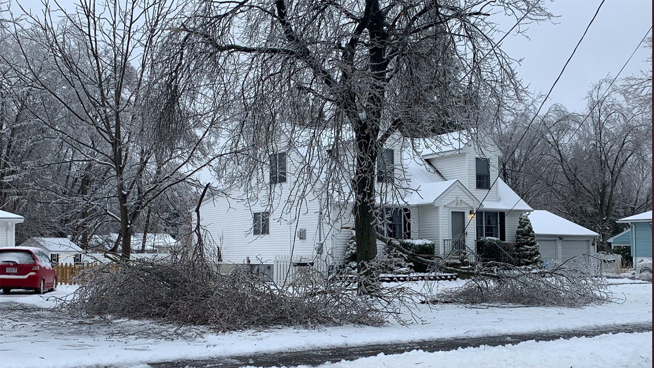 Ice-covered tree limbs knocked down power lines outside this home in North Haven, Connecticut, during Winter Storm Harper on Sunday, January 20, 2019. (Nick DiGiovanni)