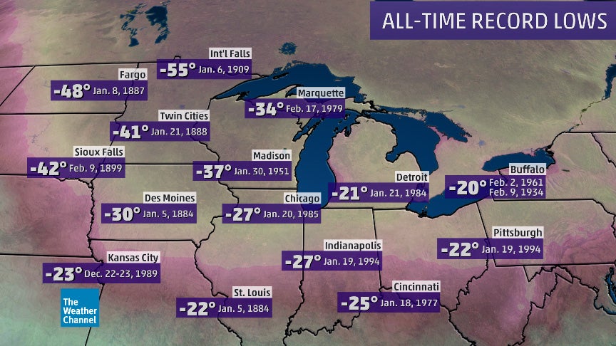 This includes Chicago, which may be within a couple of degrees of its all-time record of minus 27 degrees, set Jan. 20, 1985. Cedar Rapids and Waterloo, Iowa, could also dip to near their all-time record lows of minus 29 degrees and minus 34 degrees, respectively.