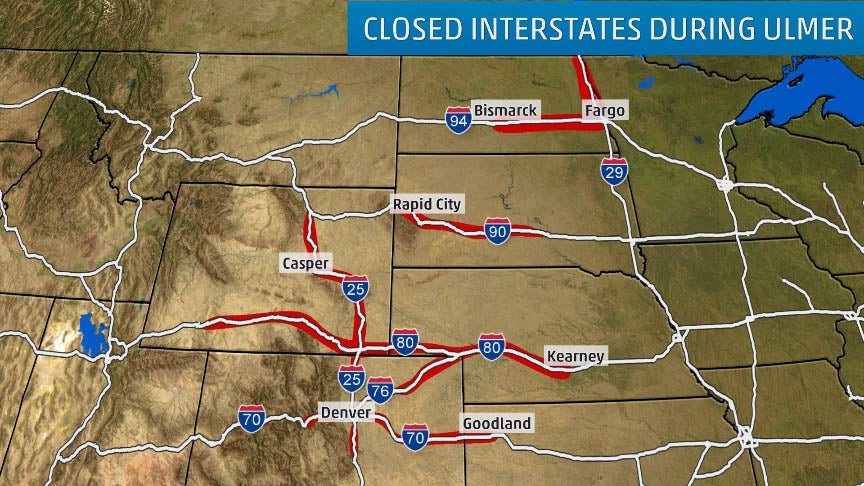 All roads in the Nebraska Panhandle, more than 350 miles of interstates in Wyoming, several interstates in Colorado and 150 miles of Interstate 90 in South Dakota were closed, in addition to the North Dakota interstates mentioned earlier.
