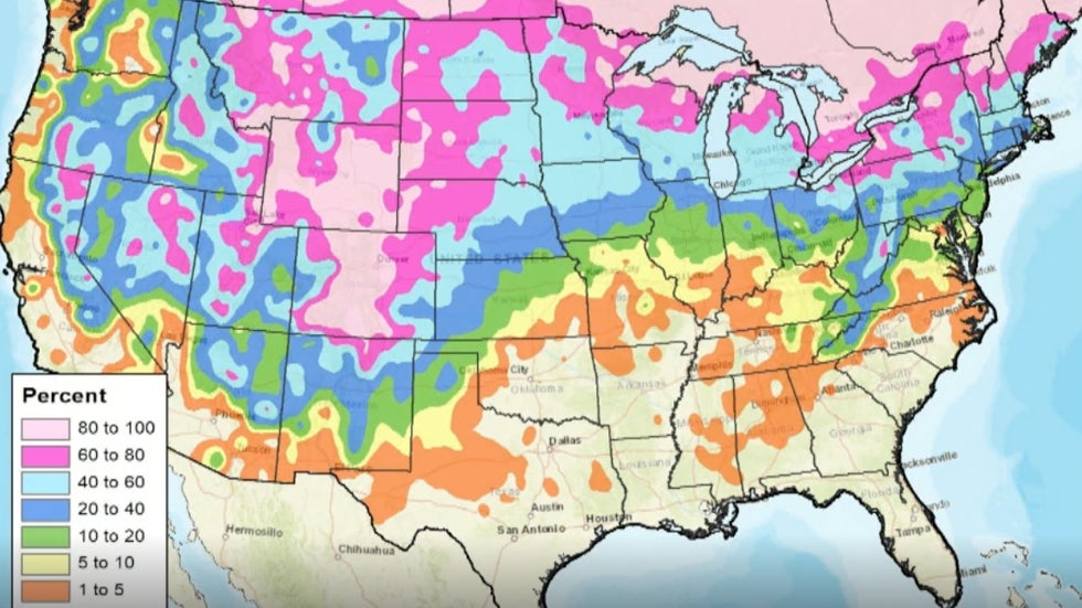 Snowfall is observed in April at least 60 percent of the time from the Rockies to parts of the northern and central Plains, northern portions of the upper Midwest, parts of the Great Lakes, northern Pennsylvania, upstate New York and northern New England, Brettschneider's map shows.