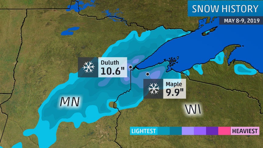 Duluth, a port city on Lake Superior and home to about 86,000 residents, received 10.6 inches of snow Wednesday afternoon into Thursday morning, easily making it the city's heaviest snowstorm for May in records back to 1884. Duluth's previous record May snowstorm was 5.7 inches May 2-5, 1954.