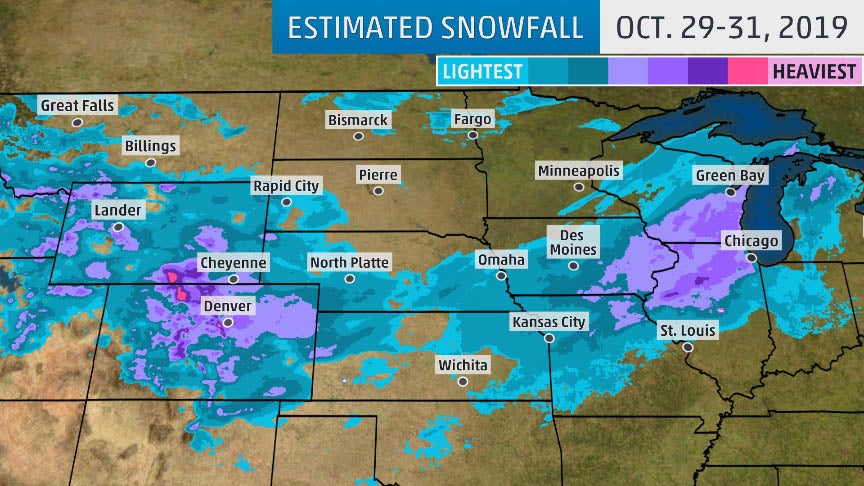 An early season snowstorm will finish up in the Great Lakes on Halloween after bringing snow to parts of the Plains, Midwest and Rockies earlier in the week.