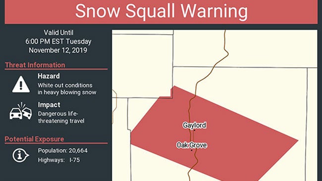 An example of a National Weather Service snow squall warning from Nov. 12, 2019 in northern Michigan.