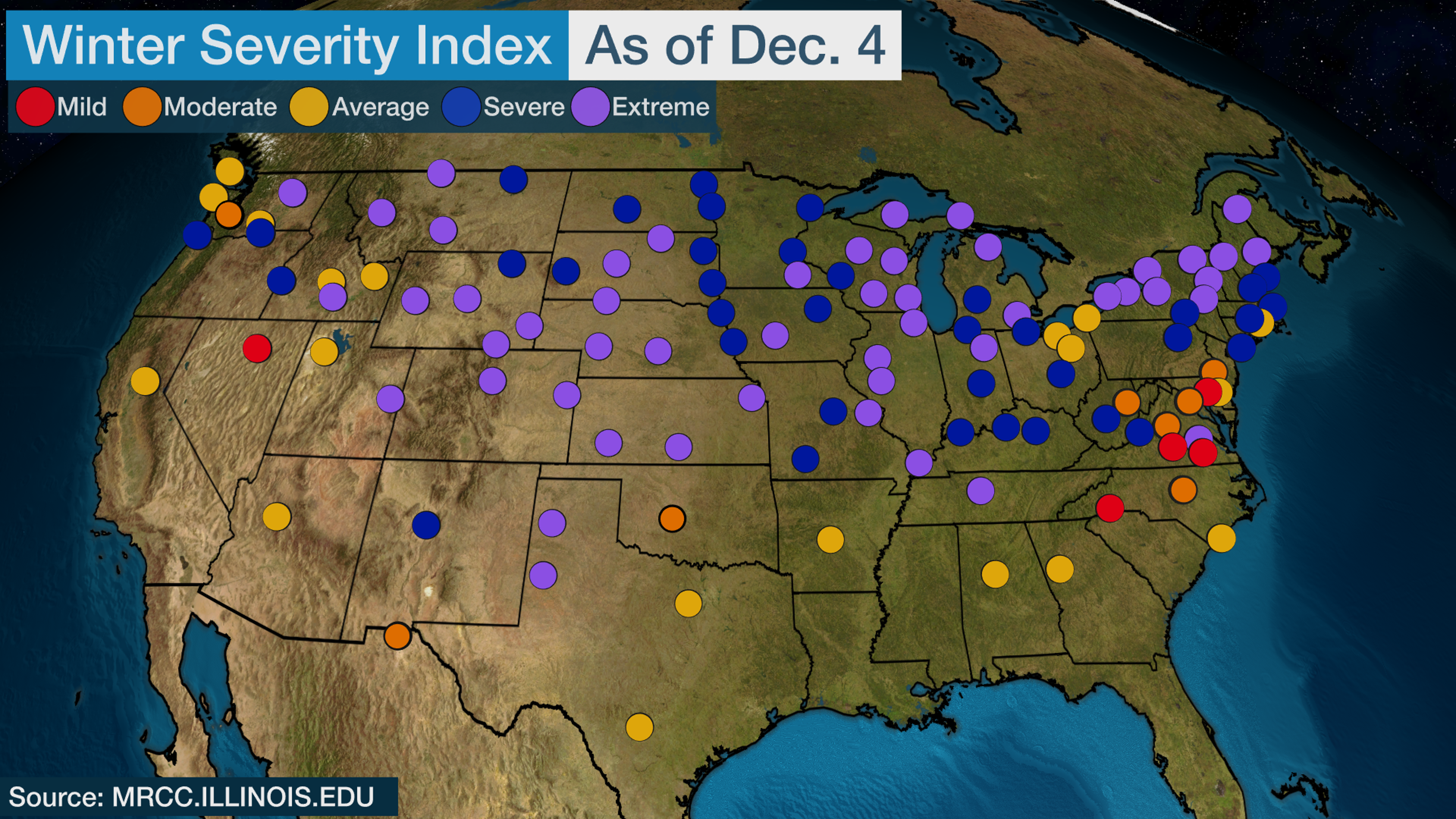 Parts of upstate new York and northern New England have also had an extreme winter so far, according to the Accumulated Winter Season Severity Index (AWSSI) from the Midwest Regional Climate Center (MRCC).