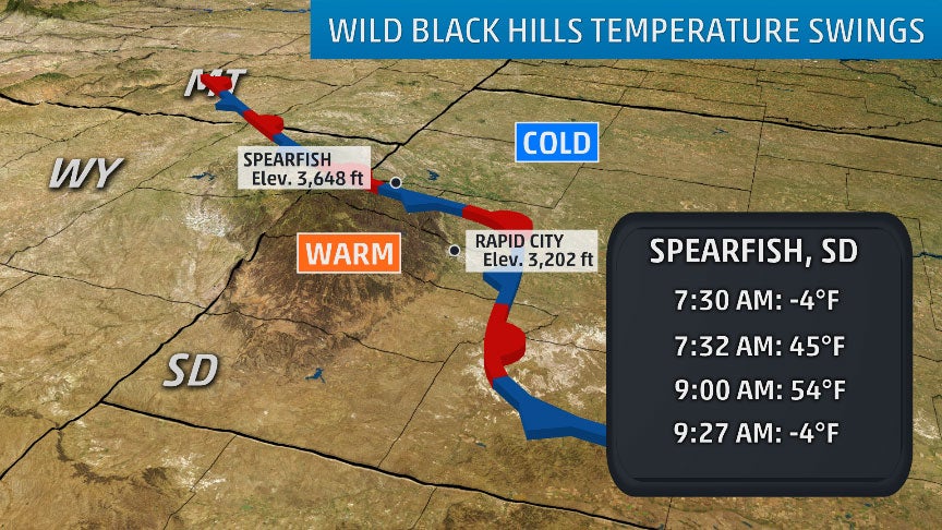 "The wild temperature fluctuations were likely due to cold air and warm air sloshing back and forth along the plains at the base of the Black Hills. A similar effect would be to pour warm water into a shallow bowl of cold water. The water would slosh back and forth a few times before settling down. This is likely what happened with the warm and cold air along the Black Hills."