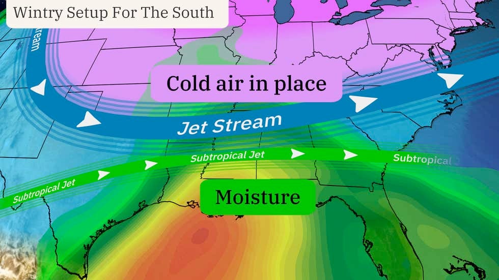 The track of the storm is also favorable, where low pressure moves from near the Gulf Coast to off the Southeast coast. That helps draw Gulf moisture into the colder air, allowing snow, sleet and freezing rain to develop.