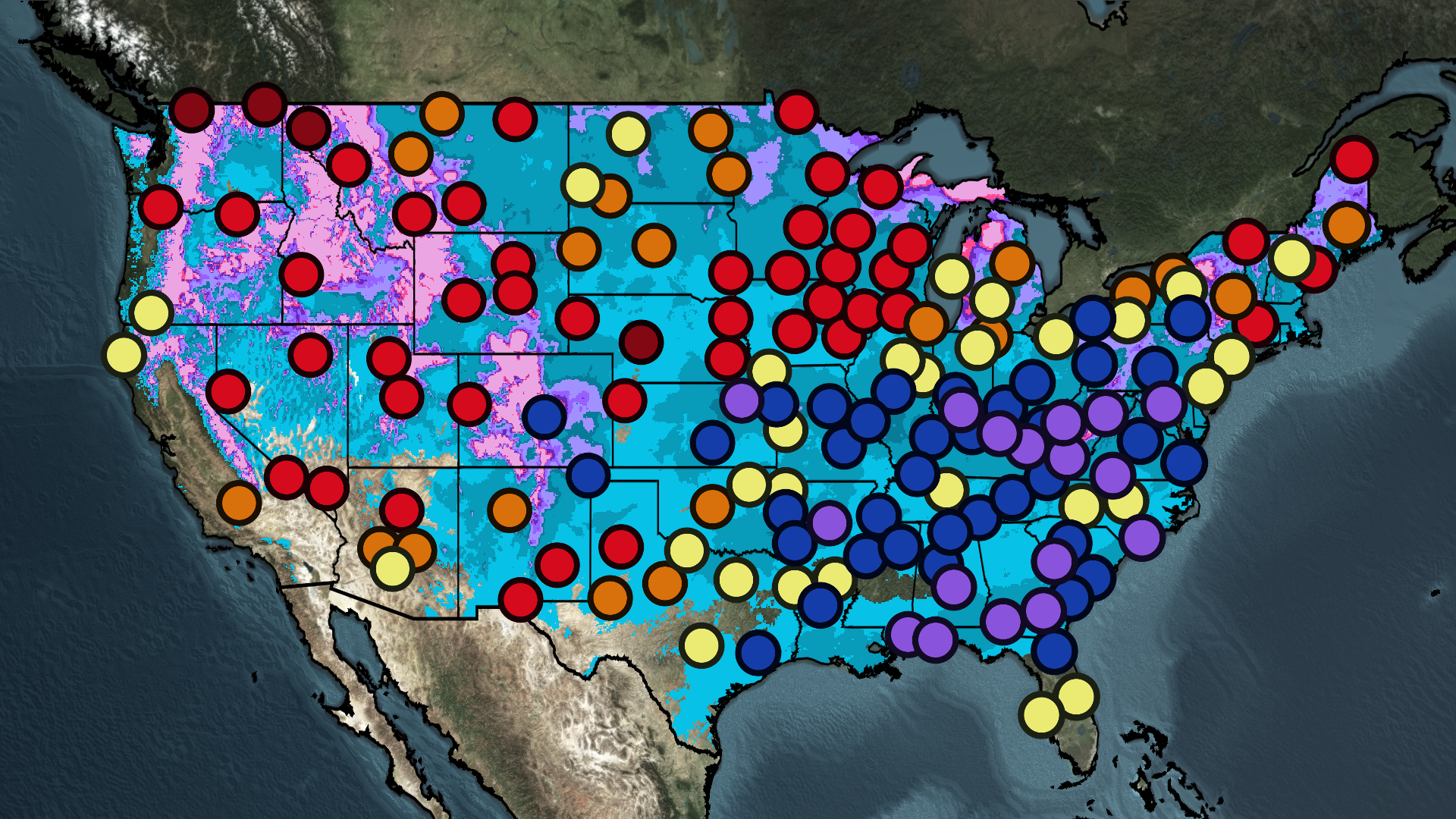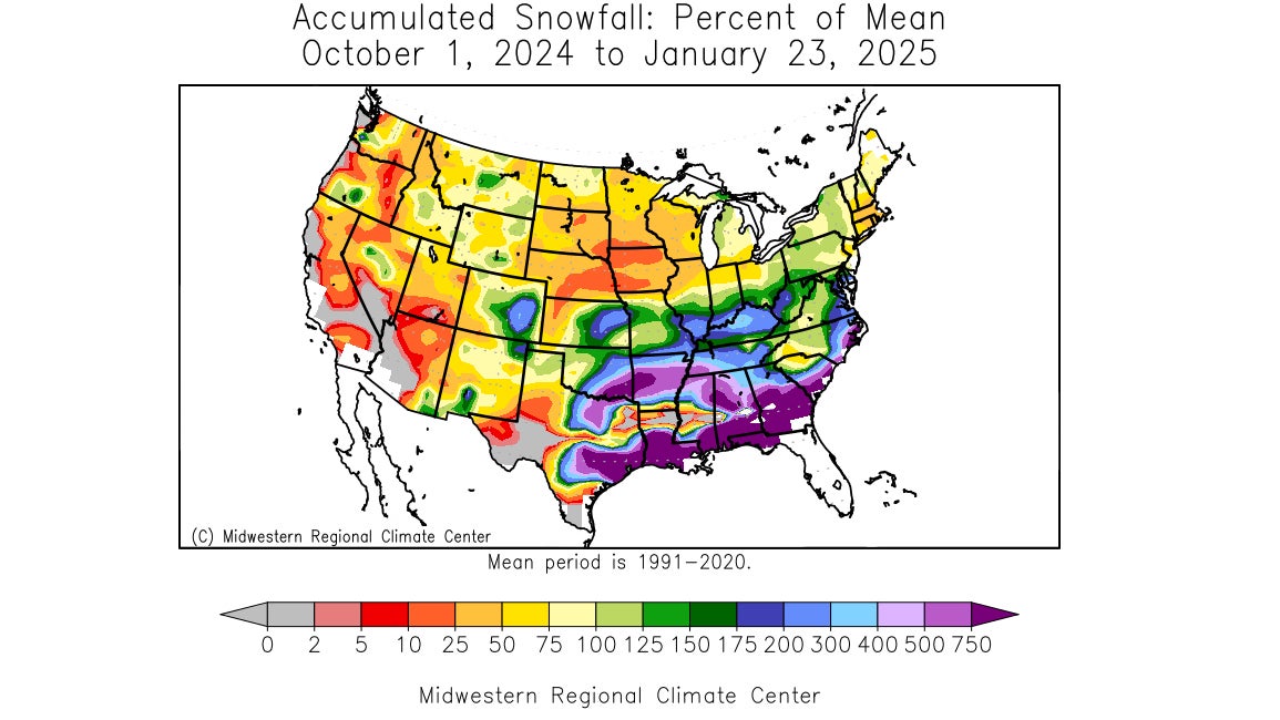 Most stations in the Midwest, Plains, Rockies, West and even Northeast and New England are experiencing a mild or moderate winter season, according to the misery map. That’s because parts of the Midwest and northern Plains have only received 10-20% of their annual snowfall to date this season, while the South has received more than 700% of their annual snowfall.