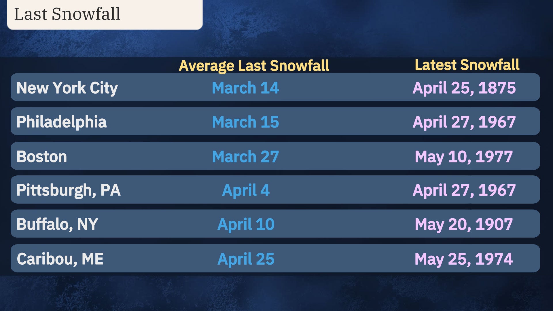• Central And Eastern States: The final snow happens in March for most cities in the Northeast Megalopolis, Ohio and mid-Mississippi valleys and Central Plains. It's April from northern New England and parts of the interior Northeast to the Great Lakes, upper Midwest and Northern Plains.