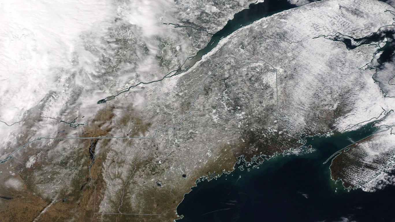 The snow cover is easily visible on NASA's Worldview visible satellite, as depicted by the white areas in Maine, New Hampshire, Vermont, New York's Adirondacks and, to the east of Maine, parts of New Brunswick and Nova Scotia.