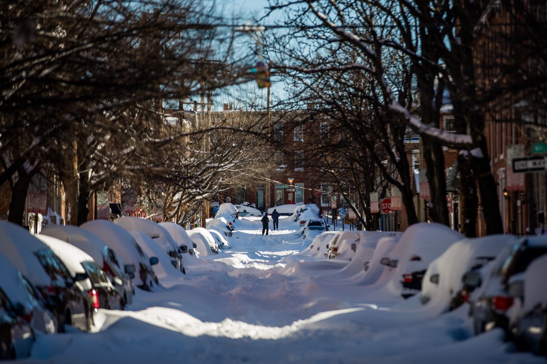 People begin to venture out to assess the damage after Winter Storm Jonas dropped nearly 30 inches of snow in Baltimore, MD on Sunday, January 24, 2016.