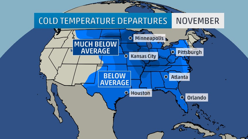 Thanks to a procession of cold fronts tapping air from Siberia and the North Pole in mid-November, several locations witnessed one of their coldest Novembers on record: