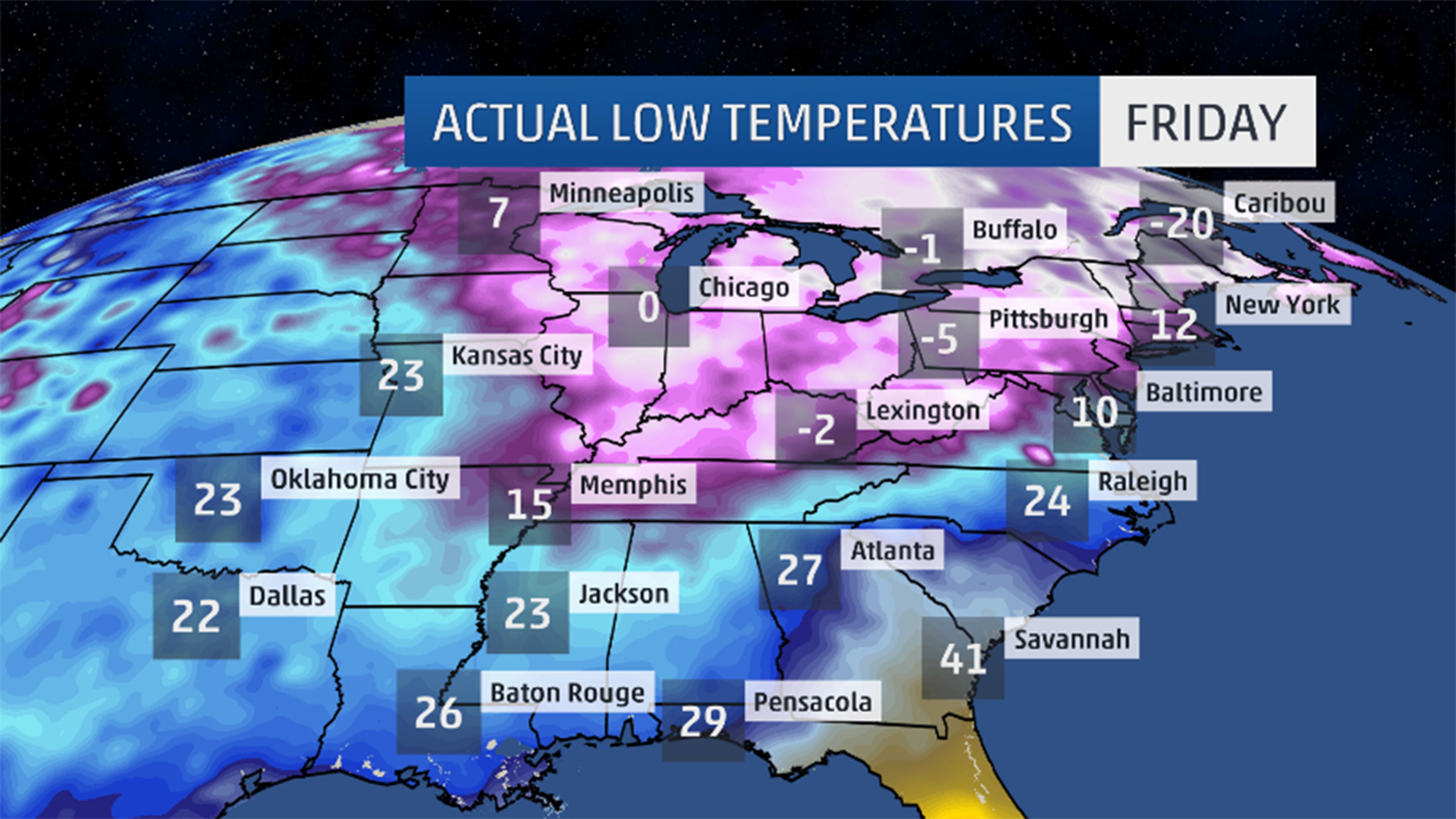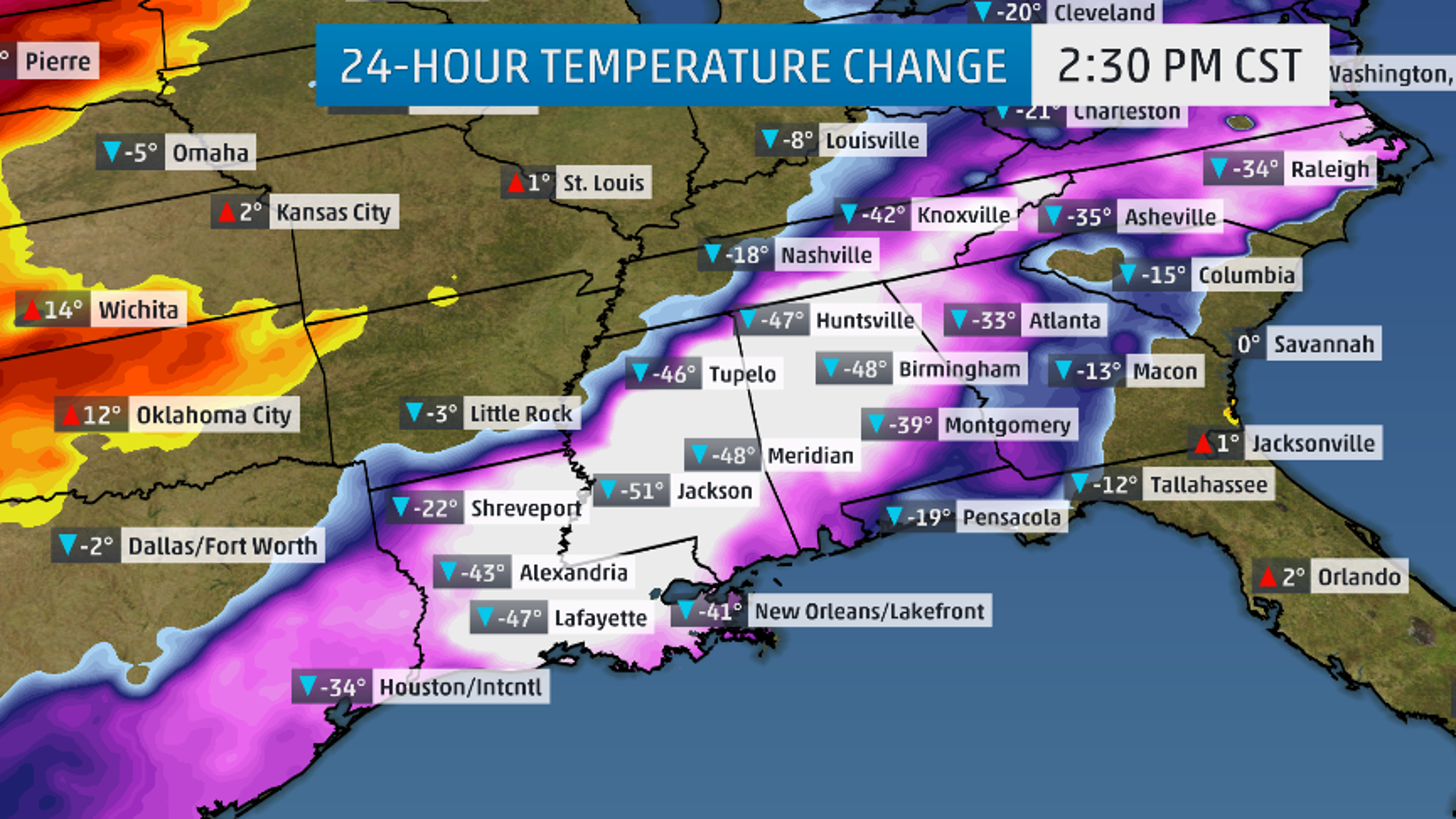 Thursday afternoon featured another huge temperature gradient across the Southeast, with readings at 1:45 p.m. ET ranging from the 20s, 30s and 40s to the 80s. In Jackson, Mississippi, the 2 p.m. CST temperature was 81 degrees Wednesday; at the same time Thursday, it was 30 degrees.