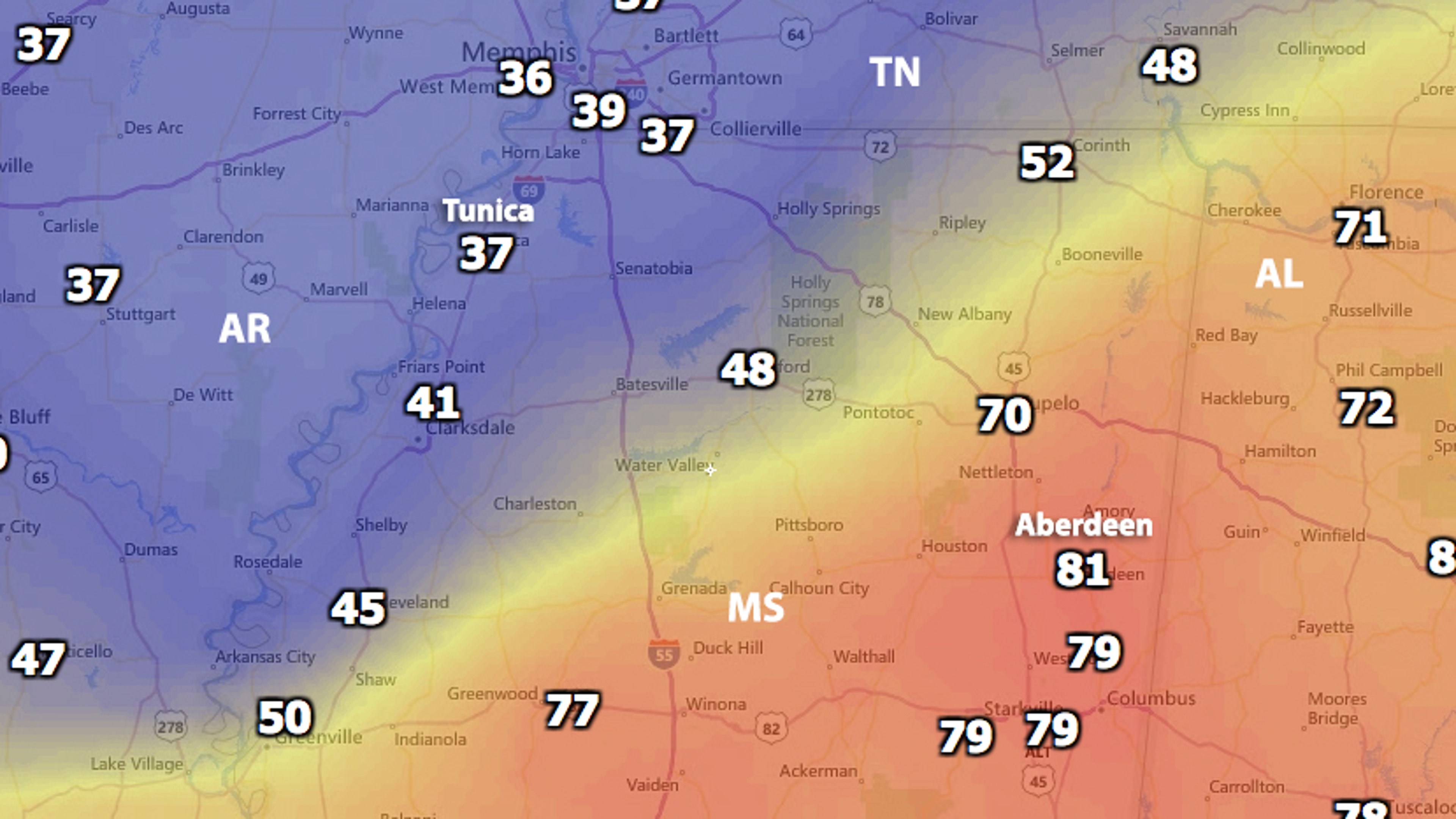 Map showing the incredible temperature contrast in Mississippi and adjacent parts of Alabama, Tennessee and Arkansas around 1:30 pm CT on Wednesday. Tunica (37 degrees) and Aberdeen (81 degrees) in Mississippi are highlighted.