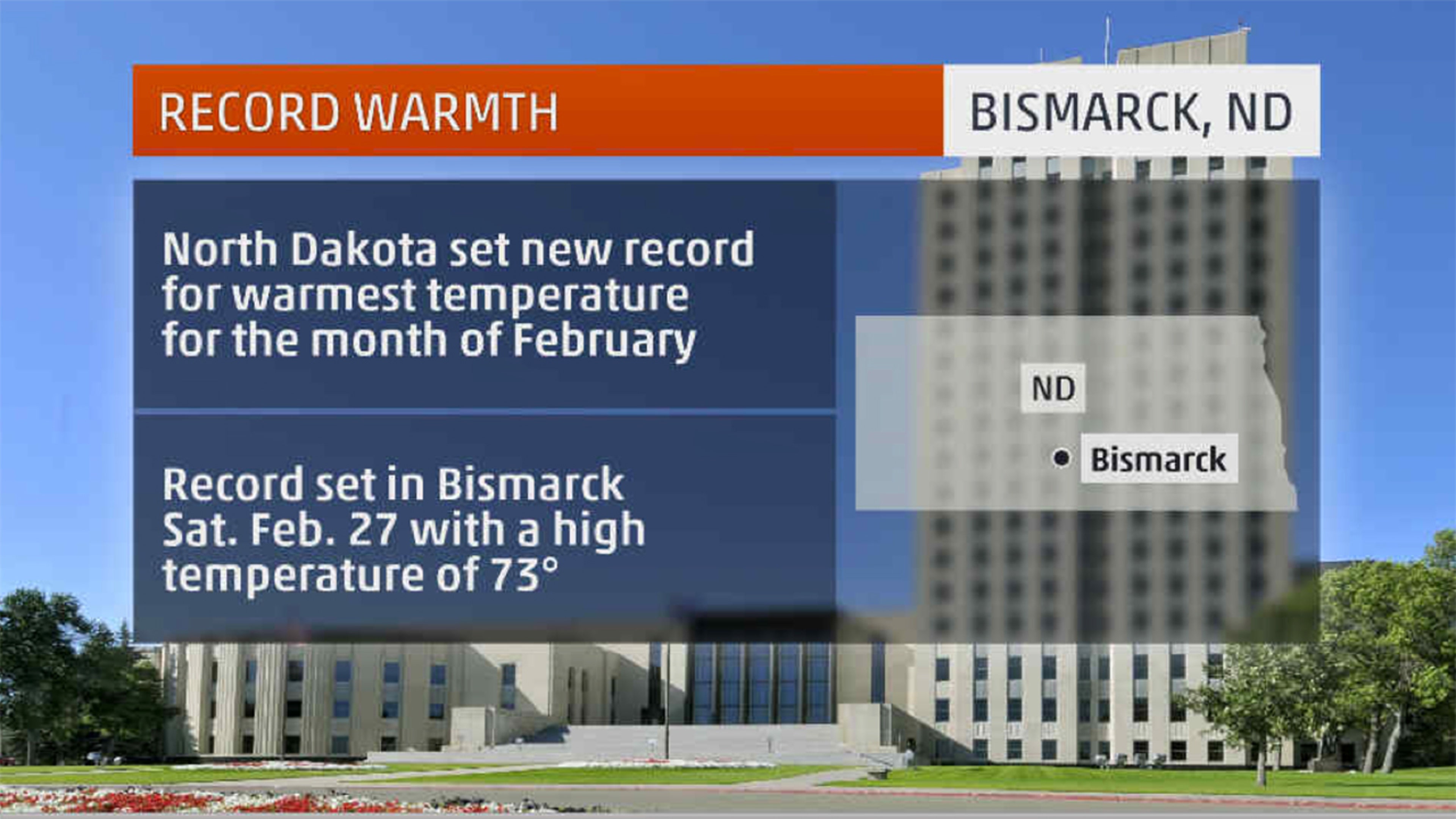 In addition to setting a monthly record for Bismarck, the high of 73 degrees also set a record for warmest temperature recorded during the month of February for the entire state of North Dakota. The previous record for the state was 72 degrees which was set on Feb. 29, 1992, at Fort Yates and Breien.