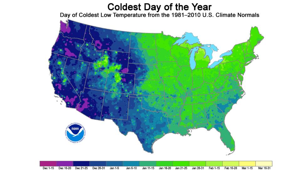 A map from NOAA's National Centers for Environmental Information provides a more detailed look at when the coldest day of the year, on average, occurs across the United States.