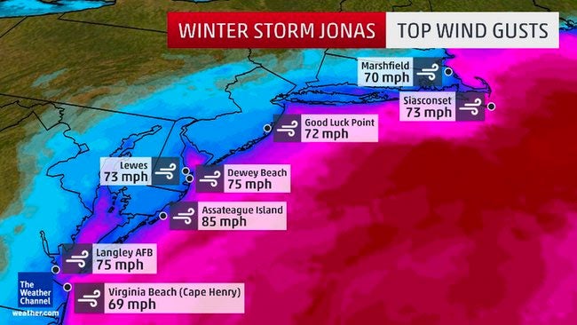 Very high winds developed over the Mid-Atlantic, just north of the low pressure center associated with Winter Storm Jonas, later expanding into parts of southeastern New England.