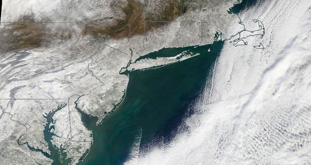 Satellite image from Sunday, Jan. 24, 2016 showing the snow cover left behind by Jonas in the mid-Atlantic and Northeast.
