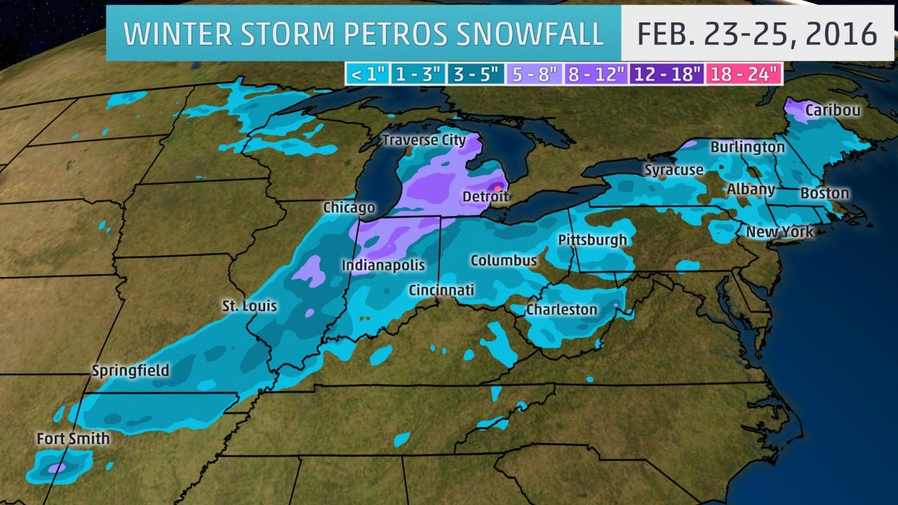 Winter Storm Petros affected areas from the Midwest to the Northeast between Feb. 23 and 25, 2016. The heaviest snow was reported in Indiana and Michigan, where some locations observed more than a foot of snow.