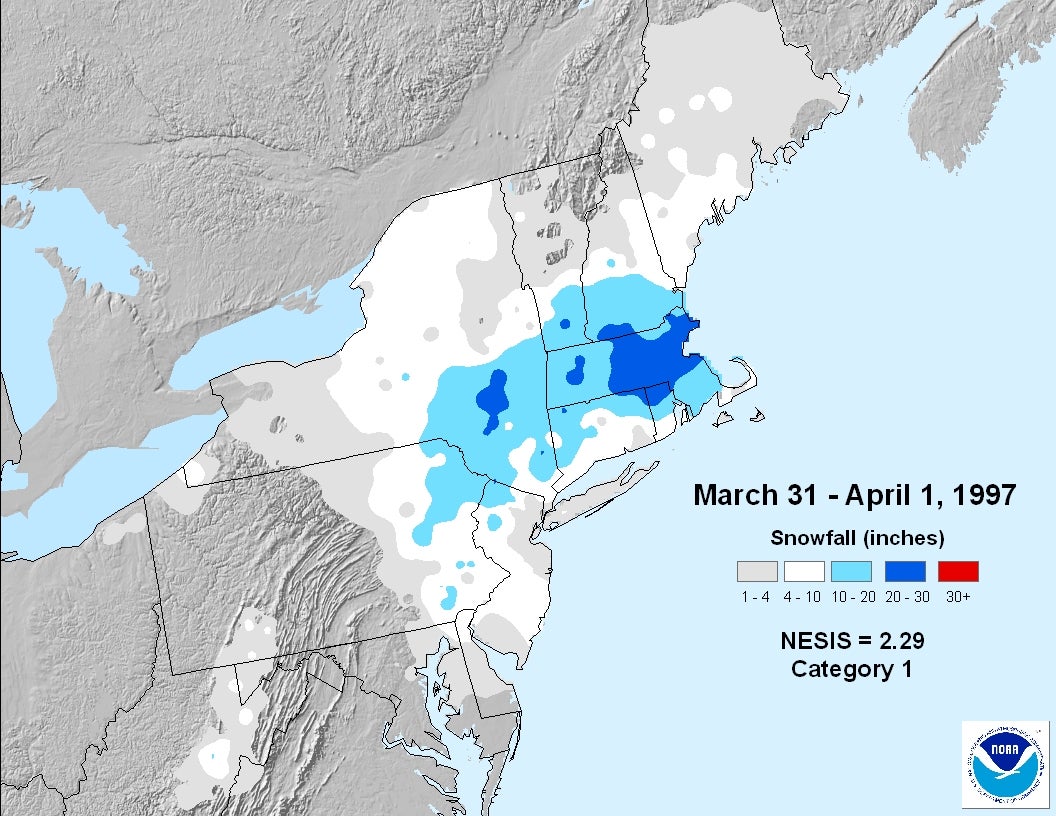 In 1997, heavy snow buried portions of central and southern New England into the Catskills of New York and the Poconos of Pennsylvania from March 31 to April 1.