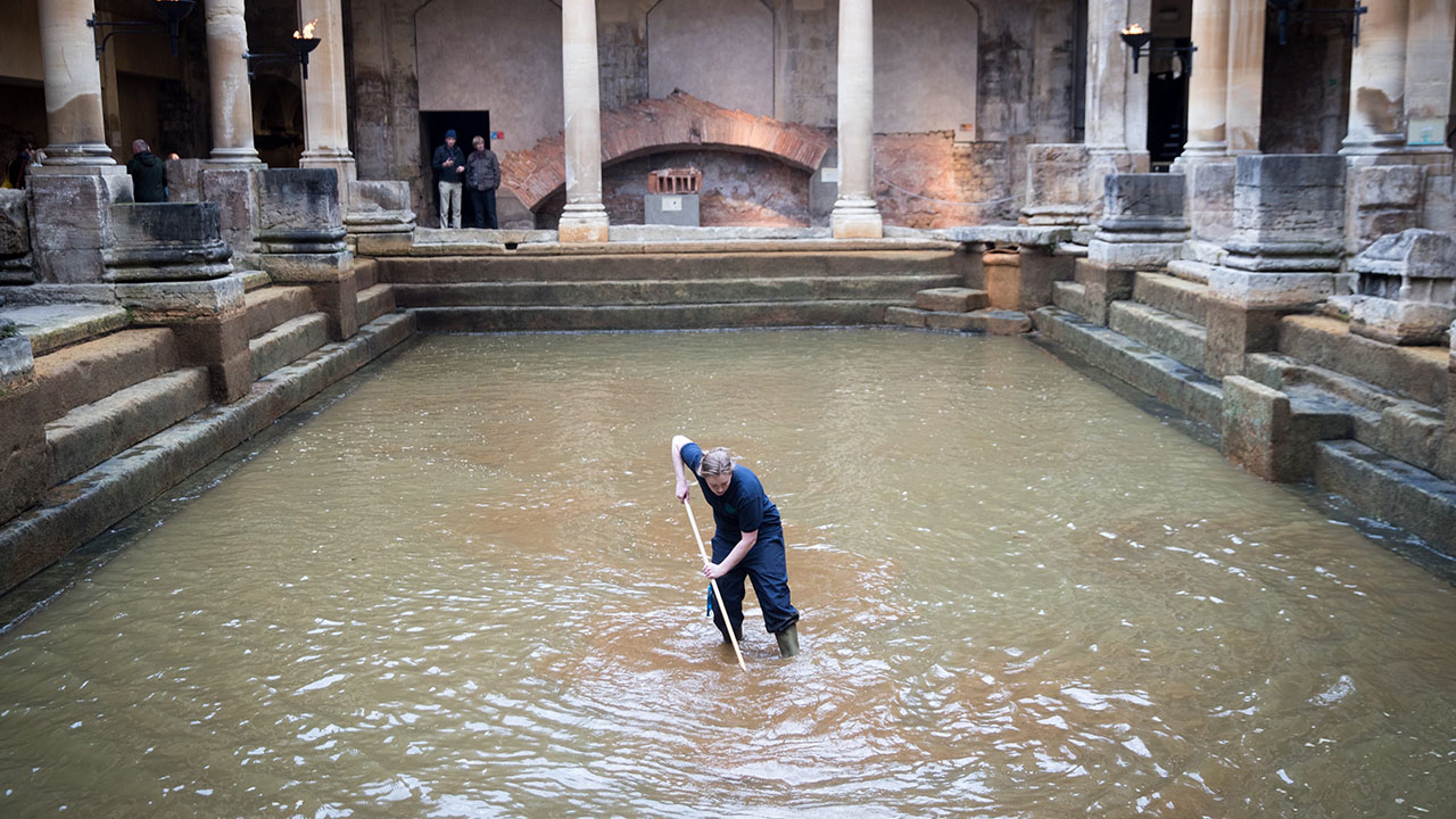 Every year, the Bath and North East Somerset Council employees clean the bath of algae and sludge from the lead-lined floor. The bath holds over 66,000 gallons of water, all of which is drained. In previous years of cleaning, items like traffic cones, shopping carts and even a moped were discovered in the bath.