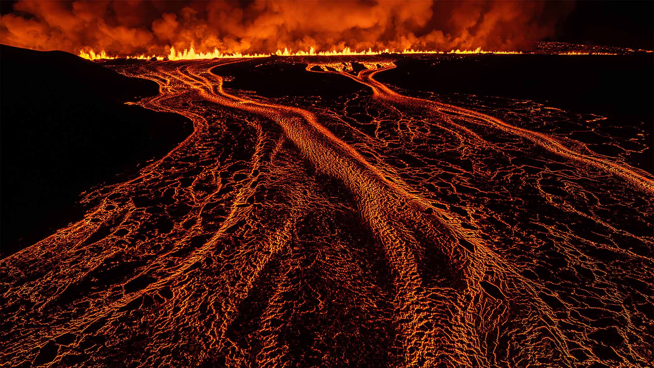 A volcano in Iceland’s Reykjanes peninsula volcano began erupting again in late November, marking the seventh time in a year that this particular volcano has done so. This eruption sent a lava flow toward the Blue Lagoon spa, one of Iceland’s most famous tourist attractions, forcing it to close as roads around it were literally blocked by lava (as shown in the photo above).