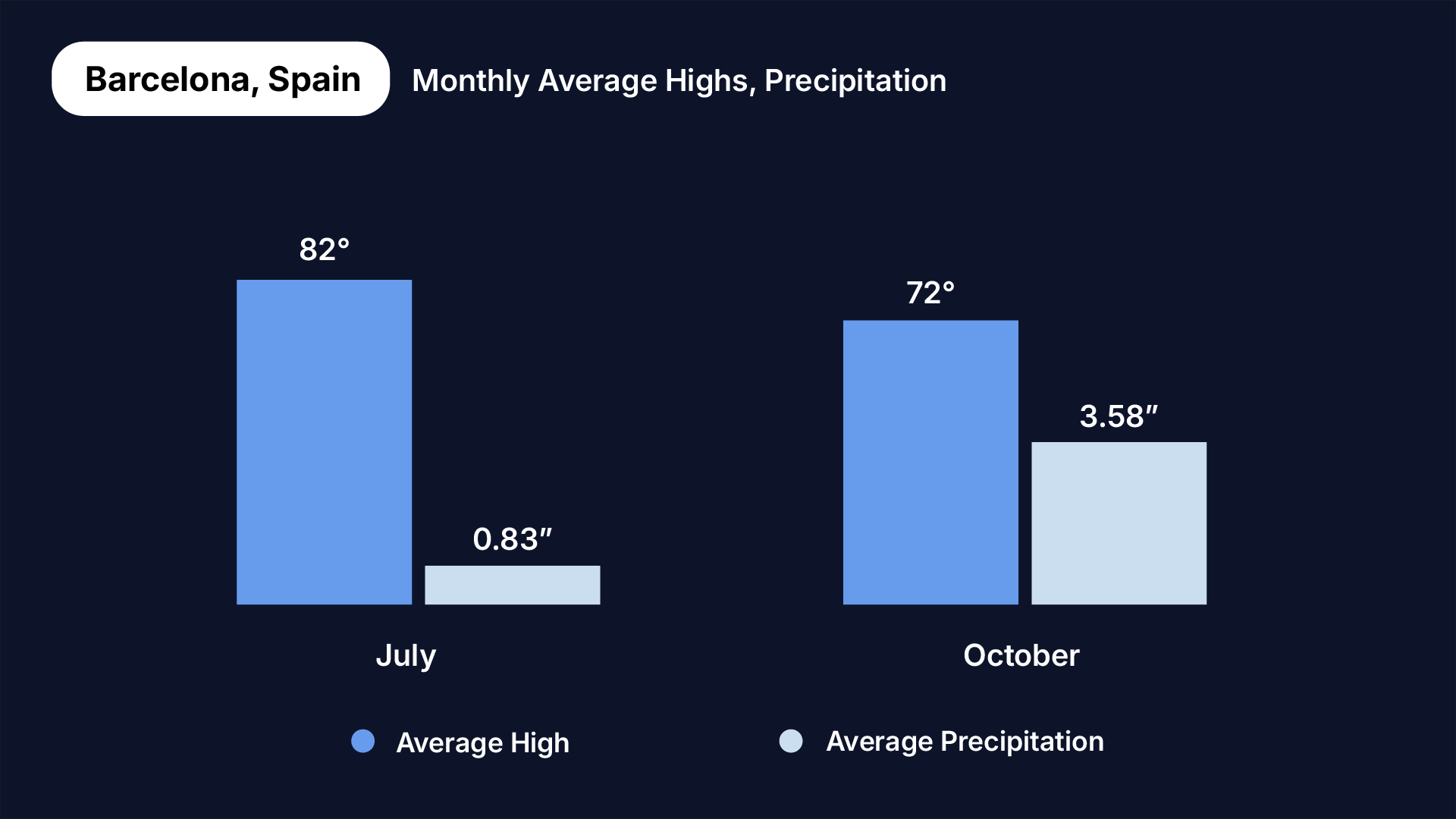 Average high temperatures (Fahrenheit) and precipitation (inches) in July (left bars) and October (right bars) in Barcelona, Spain.