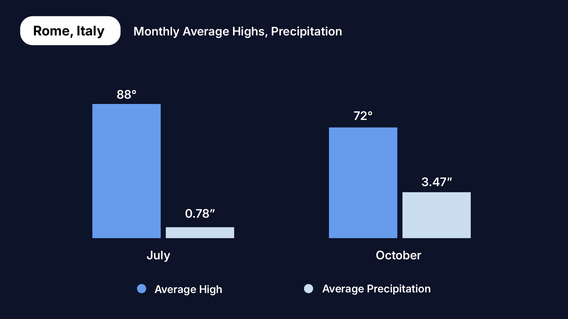 Average high temperatures (Fahrenheit) and precipitation (inches) in July (left bars) and October (right bars) in Rome, Italy.