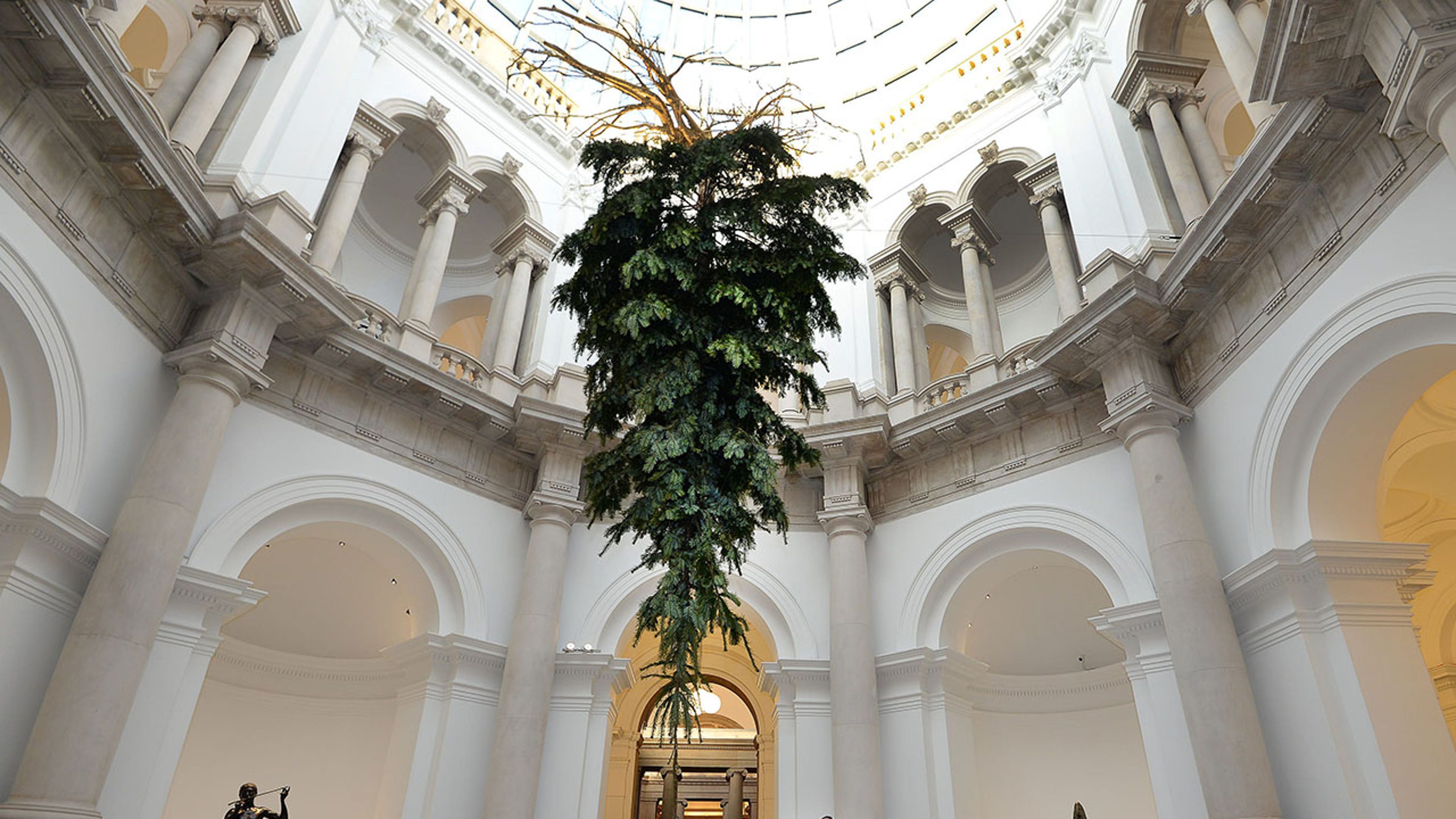 The upside-down Christmas tree hangs upside down as the centerpiece of a new series of festive commissions for the museum. The artist created a similar work for the Tate over 20 years ago, which was the last time a tree was installed inside Tate Britain.