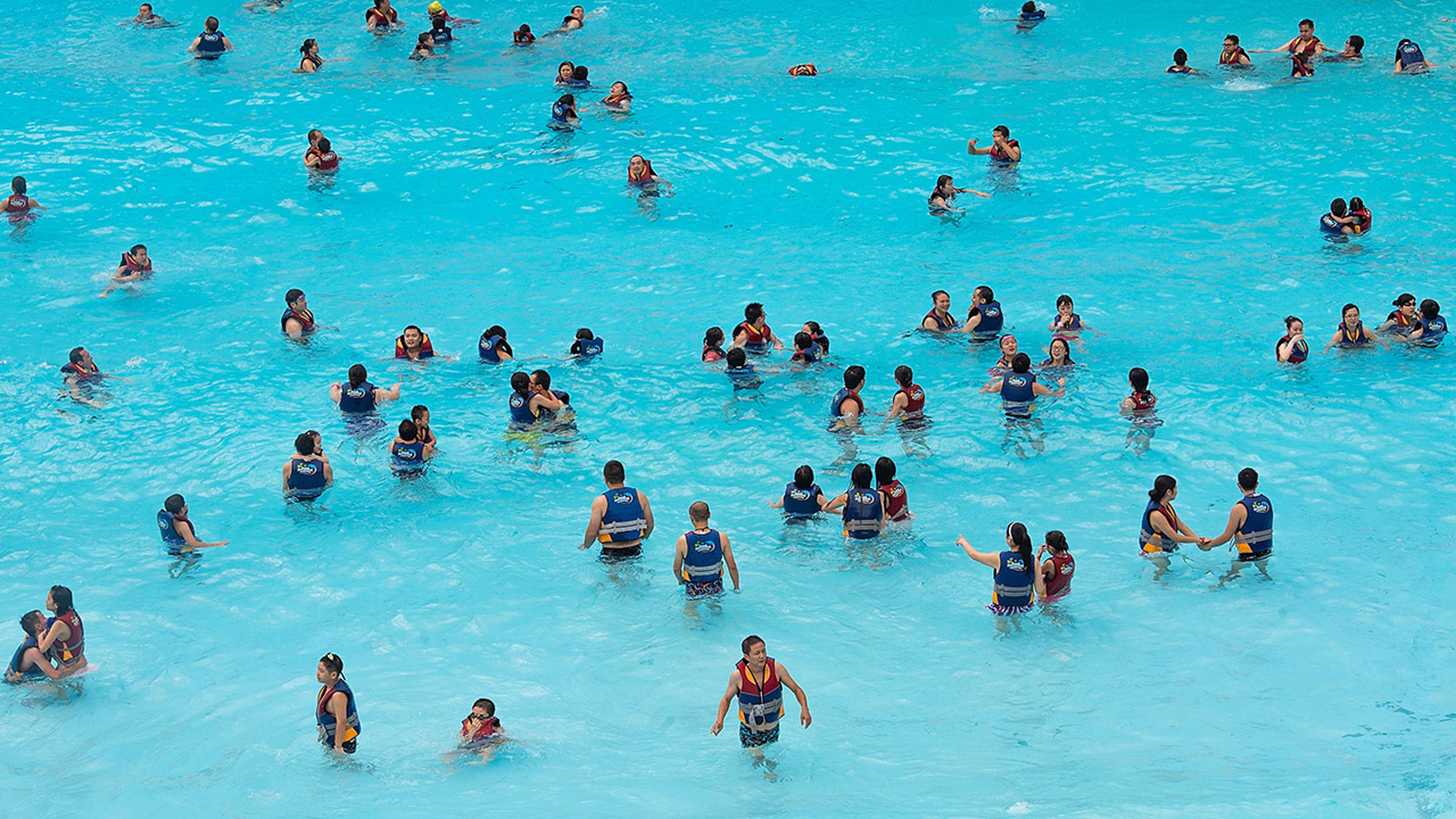 Men and women swim in the wave pool at the Paradise Island Water Park on September 20, 2014 in Chengdu, China. The Paradise Island Water Park is located inside of the New Century Global Center, the world's largest building measured by floor space, boasting 18,000,000 square feet of floor space. (Taylor Weidman/Getty Images)